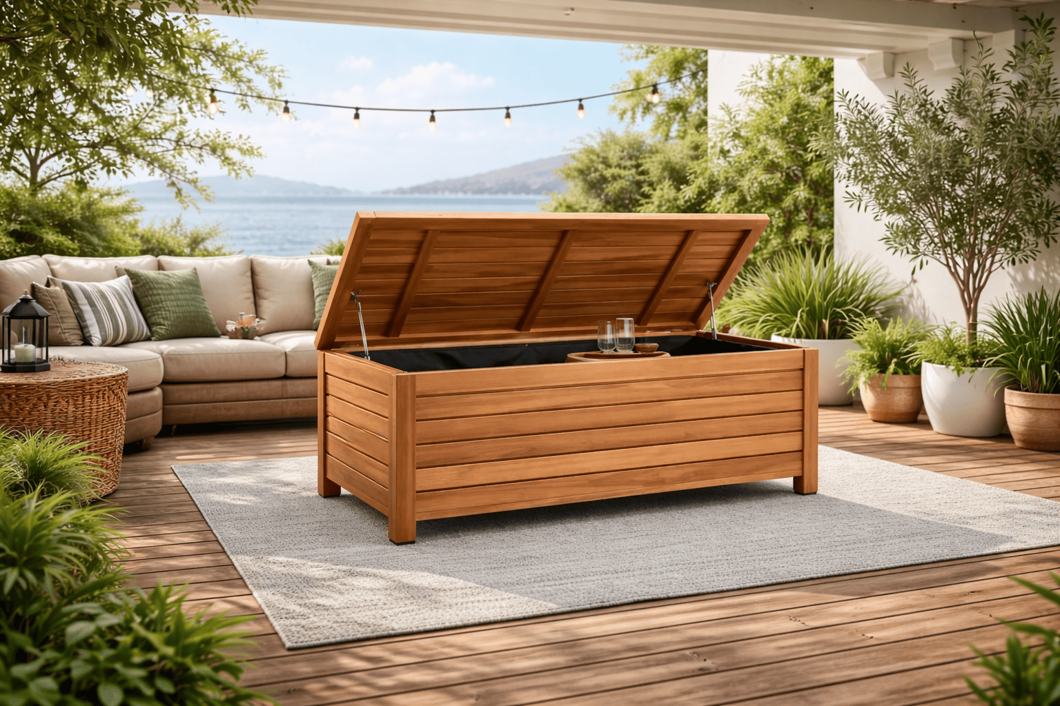 Made from durable acacia wood, this patio storage box features a hinged lid for easy access.