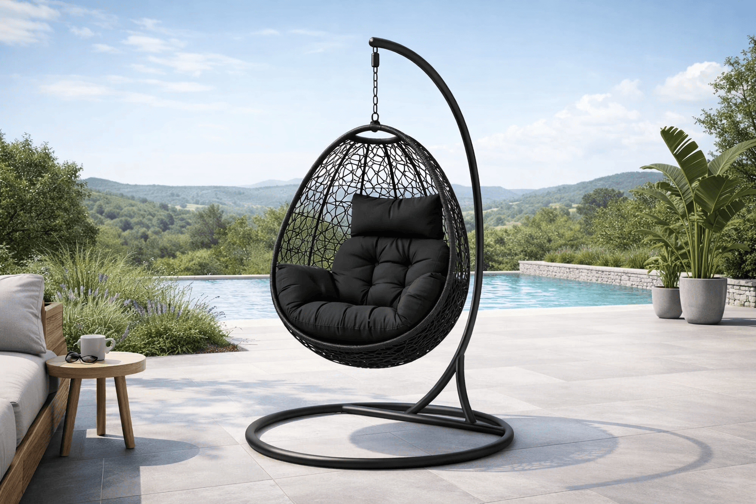 Black rattan wicker frame with a comfortable cushioned seat, designed for outdoor use on patios, balconies, and garden spaces.